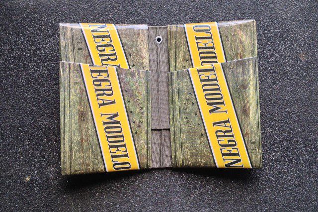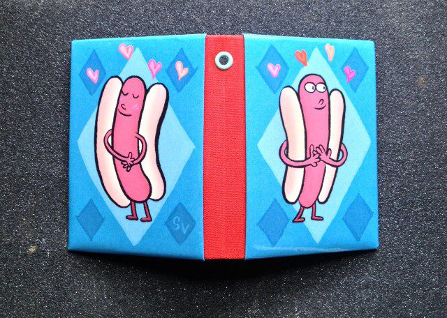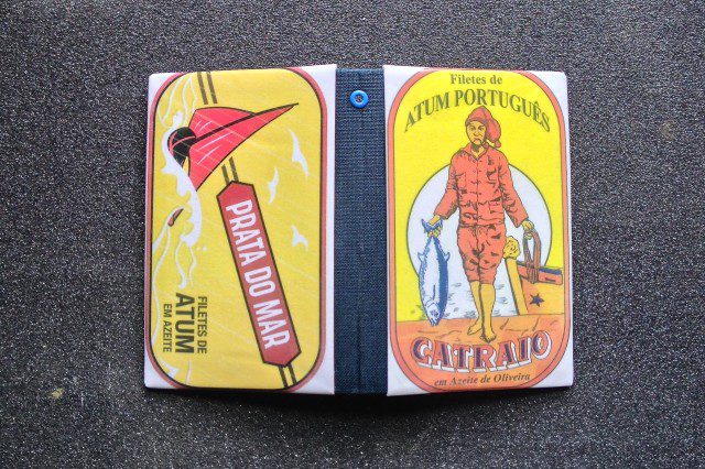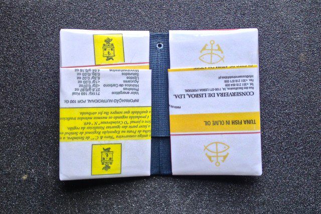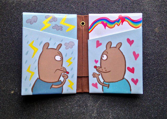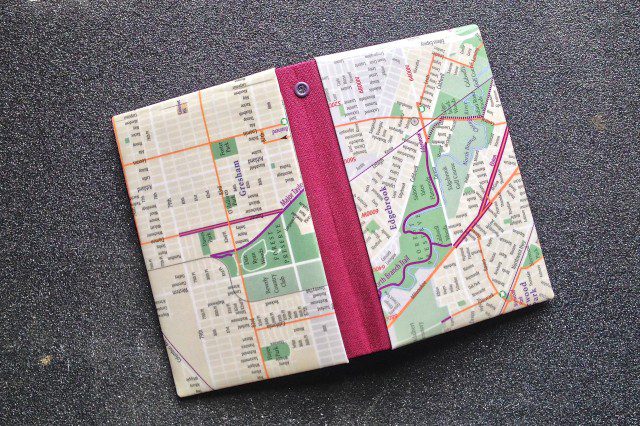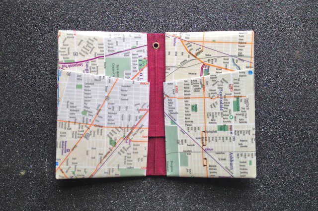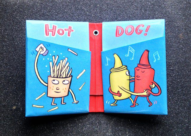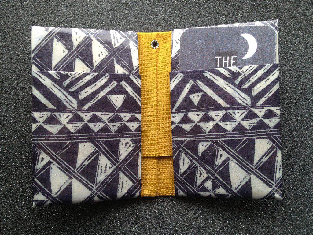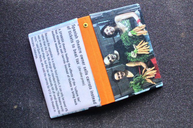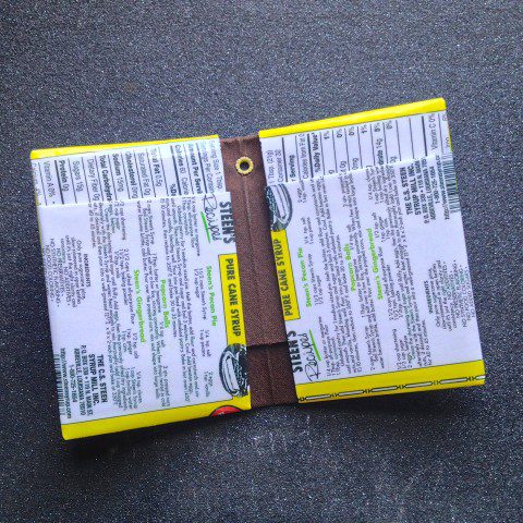 The wallets are folded from found maps, old calendars, ticket stubs, book cloth scraps, gift wrap, comic books, wallpapers, magazines and flyers, ink can labels, handmade papers, printers’ proof sheets, candy wrappers, food labels, etc.