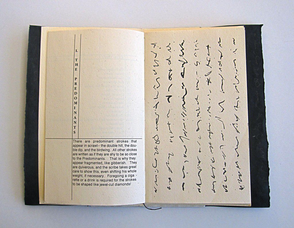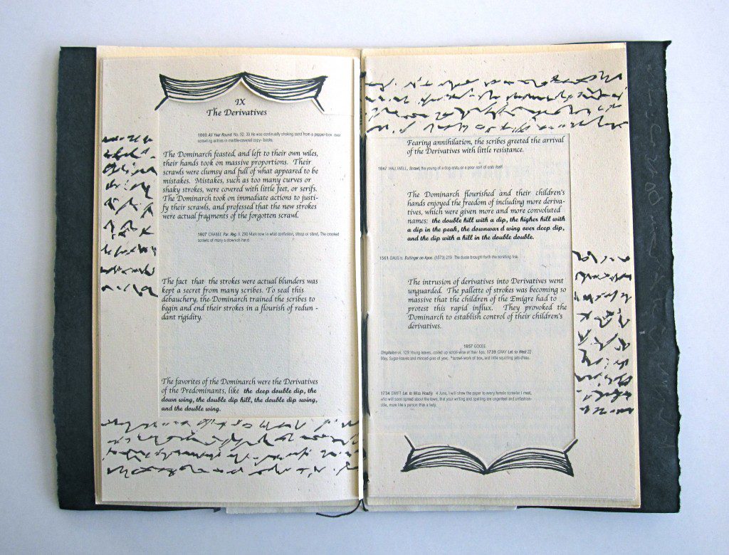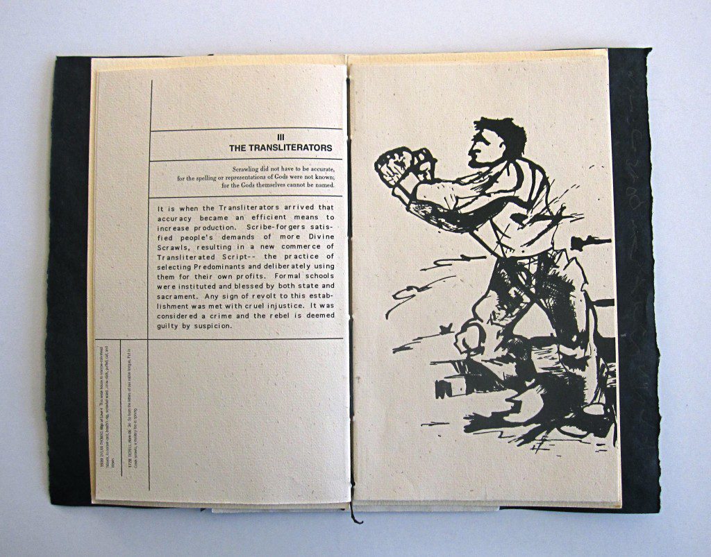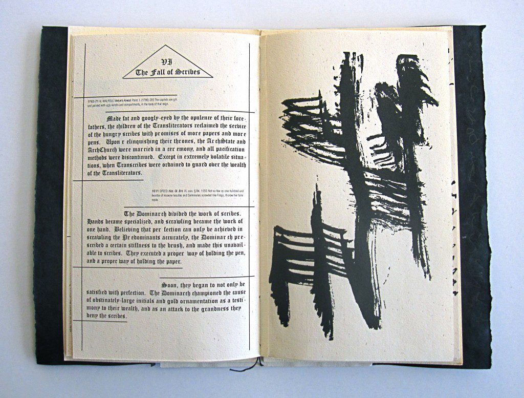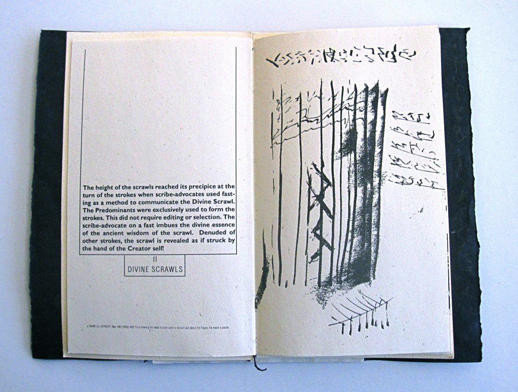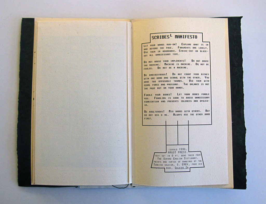 Text set in 6 pt. were taken from The Oxford English Dictionary. The polymer prints are calligraphic studies of drawings by the Turkish soldier, S. Erek, from his book, Soldier On. QuarkExpressed and printed on Gutenberg Laid. The cover is handmade abaca. © 1996.